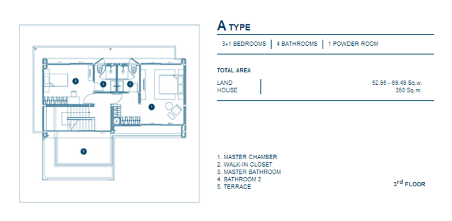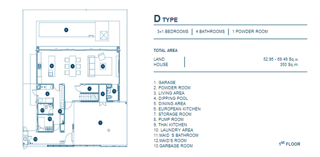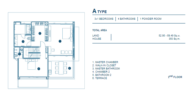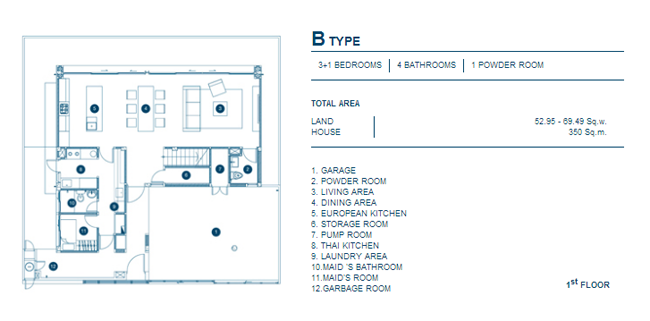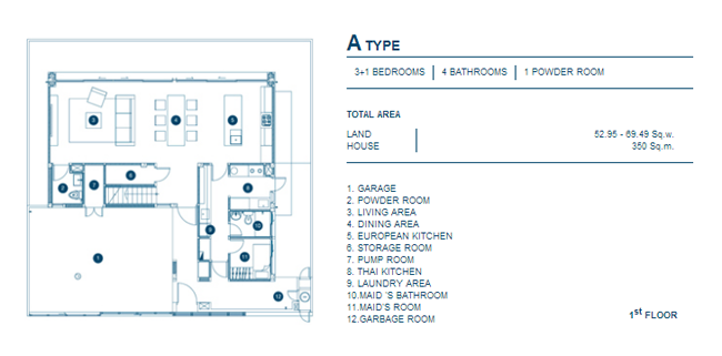 1. A Type - บ้านเดี่ยว 3 ชั้น, 3+1 ห้องนอน, 4 ห้องน้ำ, 1 Powder Room, เนื้อที่บ้านตั้งแต่ 52.95 ตร.วา, พื้นที่ใช้สอย 350 ตร.ม.