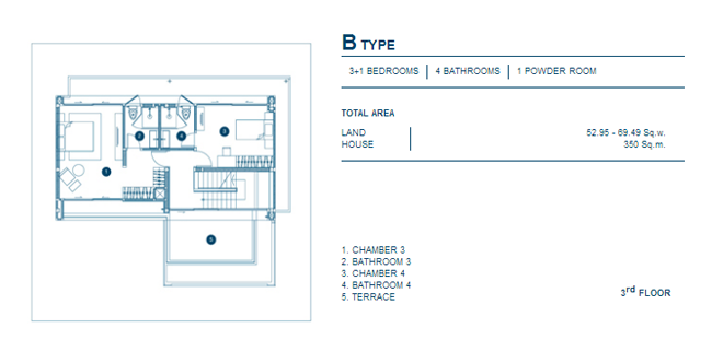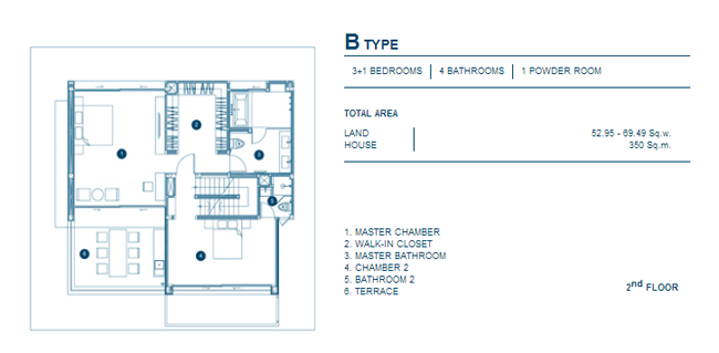 Floor Plan A Type บริเวณชั้น 3 2. B Type - บ้านเดี่ยว 3 ชั้น, 3+1 ห้องนอน, 4 ห้องน้ำ, 1 Powder Room, เนื้อที่บ้านตั้งแต่ 52.95 ตร.วา, พื้นที่ใช้สอย 350 ตร.ม.