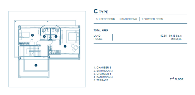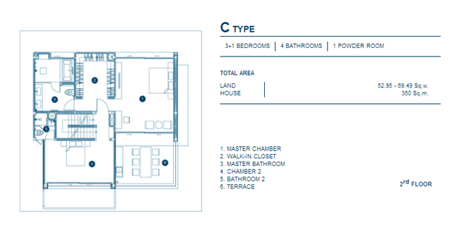 Floor Plan B Type บริเวณชั้น 3 3. C Type - บ้านเดี่ยว 3 ชั้น, 3+1 ห้องนอน, 4 ห้องน้ำ, 1 Powder Room, เนื้อที่บ้านตั้งแต่ 52.95 ตร.วา, พื้นที่ใช้สอย 350 ตร.ม.