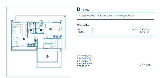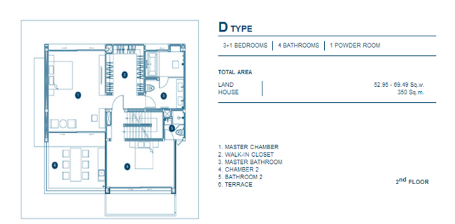 Floor Plan C Type บริเวณชั้น 3 4. D Type - บ้านเดี่ยว 3 ชั้น, 3+1 ห้องนอน, 4 ห้องน้ำ, 1 Powder Room, เนื้อที่บ้านตั้งแต่ 52.95 ตร.วา, พื้นที่ใช้สอย 350 ตร.ม.