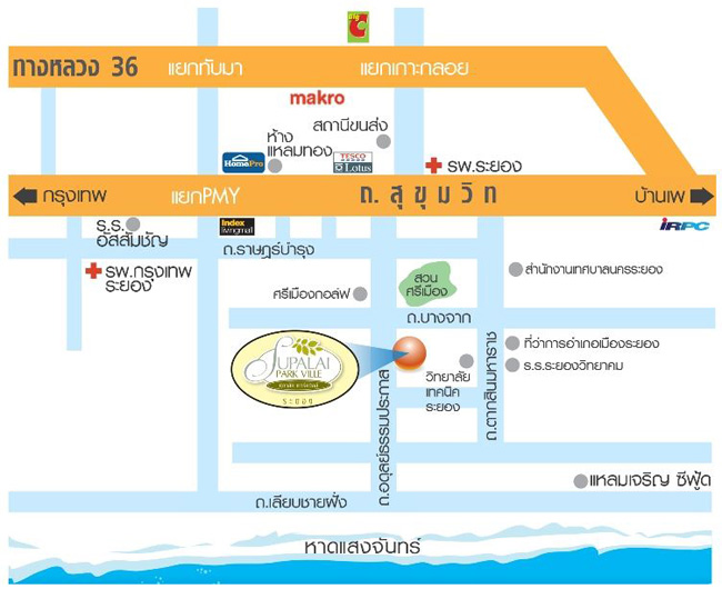แผนที่โครงการ ศุภาลัย พาร์ควิลล์ ระยอง โครงการตั้งอยู่ที่ ถนนอดุลย์ธรรมประภาส อำเภอเมืองระยอง จังหวัดระยอง เชื่อมต่อกับถนนหลักหลายเส้น เช่น ถนนสุขุมวิท, ทางหลวง 36, ถนนเลียบชายฝั่ง, ถนนตากสินมหาราช, ถนนบางจาก และถนนราษฎร์บำรุง ใกล้สถานที่สำคัญ และศูนย์การค้าต่างๆ เช่น สวนศรีเมือง, วิทยาลัยเทคนิคระยอง, โรงเรียนระยองวิทยาคม, ศรีเมืองกอล์ฟ, ที่ว่าการอำเภอเมืองระยอง, โรงพยาบาลระยอง, โรงพยาบาลกรุงเทพระยอง, แหลมเจริญซีฟู้ด, ห้างแหลมทอง, เทสโก้ โลตัส, Home Pro, Index Living Mall, Makro และบิ๊กซี ระยอง
