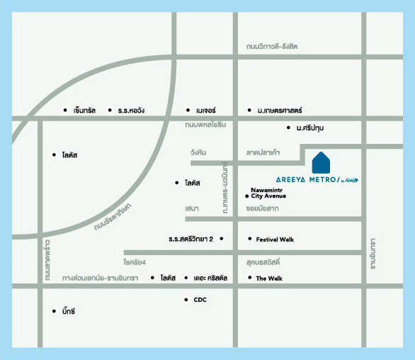 อารียา เมทโทร เกษตร - นวมินทร์ (Areeya Metro Kaset - Nawamintr) คือ การเดินทางที่แสนสะดวกสบาย จากโครงการสามารถเดินทางเข้าถนนเกษตร-นวมินทร์ หรือถนนรามอินทราได้อย่างสะดวก รายล้อมไปด้วยสิ่งอำนวยความสะดวกครบครัน อาทิ นวมินทร์ ซิตี้ อเวนิว, เฟสติวัล วอล์ค, เซ็นทรัลลาดพร้าว, เมเจอร์รัชโยธิน พร้อมคลับเฮ้าส์ดีไซน์หรูทันสมัย ฟิตเนส สระว่ายน้ำและสนามเด็กเล่น ให้คุณอบอุ่นในสไตล์โมเดิร์น กับทุกตารางนิ้วของชีวิต