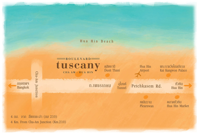 แผนที่โครงการ บูเลอวาร์ด ทัสคานี ชะอำ - หัวหิน โครงการตั้งอยู่ที่ ถนนเพชรเกษม ตำบลชะอำ อำเภอชะอำ จังหวัดเพชรบุรี 76120 เนื่องจากถนนเพชรเกษมเป็นถนนหลักสำคัญที่สามารถมุ่งหน้าไปหัวหินและจังหวัดสำคัญทางภาคใต้ ทำเลที่ บูเลอวาร์ด ทัสคานี ชะอำ - หัวหิน ตั้งอยู่นั้นจึงเป็นทำเลที่ดีเยี่ยม เพราะโครงการอยู่ติดถนนใหญ่เพชรเกษม หากเดินทางมาจากกรุงเทพมหานคร จะผ่านสี่แยกชะอำ จากสี่แยกชะอำขับตรงไปทางหัวหินอีกประมาณ 4 กม. โครงการจะอยู่ฝั่งซ้ายมือ ใกล้สถานที่สำคัญต่างๆ เช่น โรงแรมดุสิตธานี, สนามบินหัวหิน, เพลินวาน, เวเนเซีย หัวหิน, สปริงฟิลด์ บีช รีสอร์ท และวีรันดา รีสอร์ท แอนด์ สปา