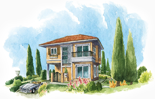 ภาพจำลองแบบบ้าน SIENA 2. LUCCA - บ้านเดี่ยว 2 ชั้น 2 ห้องนอน 3 ห้องน้ำ ที่จอดรถ 2 คัน พื้นที่ใช้สอย 170 ตร.ม. ปล่อยอารมณ์ให้ผ่อนคลายไปกับวิวของธรรมชาติ และฟังเสียงน้ำตกที่อยู่หลังบ้าน