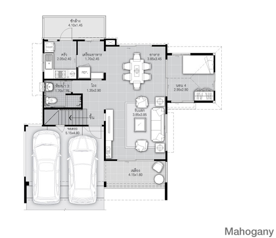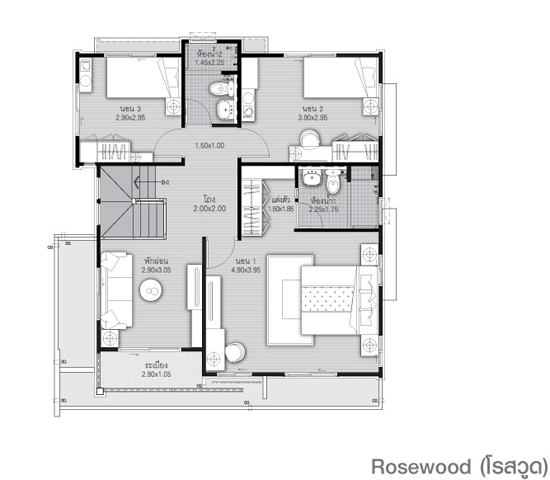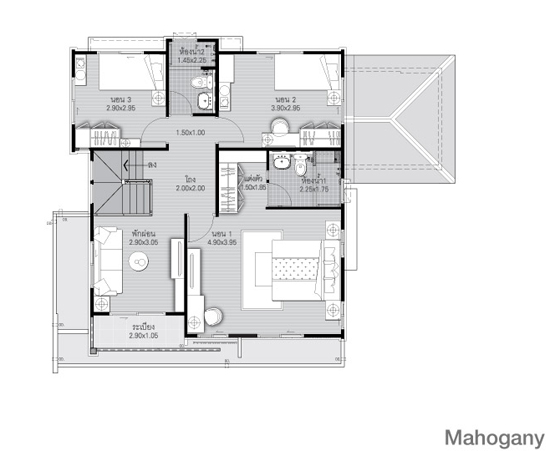 Floor Plan Rosewood ชั้นบน 2. Mahogany - บ้านเดี่ยว พื้นที่ใช้สอย 173 ตร.ม. ขนาดที่ดินตั้งแต่ 90 ตร.วา 4 ห้องนอน 3 ห้องน้ำ 1 ห้องพักผ่อน พร้อมที่จอดรถ 2 คัน
