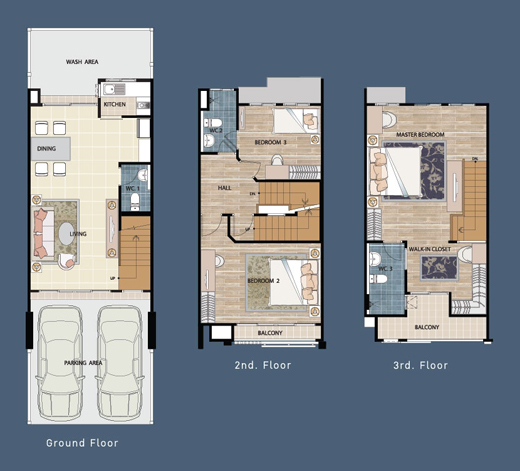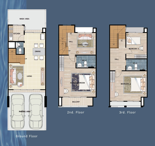 Floor Plan Moon Suite 2. Star Suite - ทาวน์โฮม 3 ชั้น หน้ากว้าง 5.00 เมตร พื้นที่ 20 ตร.วา พื้นที่ใช้สอย 162 ตารางเมตร ขนาด 3 ห้องนอน 3 ห้องน้ำ ที่จอดรถ 2 คัน ห้องนอนใหญ่สไตล์ Penthouse เต็มพื้นที่บนชั้น 3