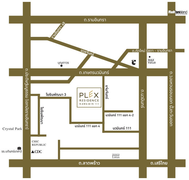 แผนที่โครงการ เพล็กซ์ เรสซิเดนซ์ นวมินทร์ 111 โครงการตั้งอยู่ที่ ถนนประเสริฐมนูกิจ (ถนนเกษตรนวมินทร์) ซอยแจ่มจันทร์ แขวงคลองกุ่ม เขตบึงกุ่ม กรุงเทพมหานคร 10230 โครงการนี้สามารถเข้าได้ทั้งทางซอยแจ่มจันทร์หรือเข้าซอยนวมินทร์ 111 ก็ได้ เชื่อมต่อกับถนนหลักหลายเส้น เช่น ถนนประเสริฐมนูกิจ, ถนนนวมินทร์, ถนนรัชดา-รามอินทรา, ถนนลาดพร้าว และถนนเลียบทางด่วนรามอินทรา สะดวกสบาย ด้วยทางด่วนรามอินทรา-อาจณรงค์ ใกล้กับสถานที่สำคัญ และศูนย์การค้าต่างๆ เช่น บิ๊กซี, บุญถาวร, แม็กซ์แวลู, Chic Republic, DCC, คริสตัล พาร์ค, เดอะ วอล์ค, โรงเรียนเลิศหล้า, โรงเรียนบดินทรเดชา (สิง สิงหเสนีย์ 2), ช็อคโกแลต วิลล์ และ อินเด็กซ์ ลิฟวิงมอลล์
