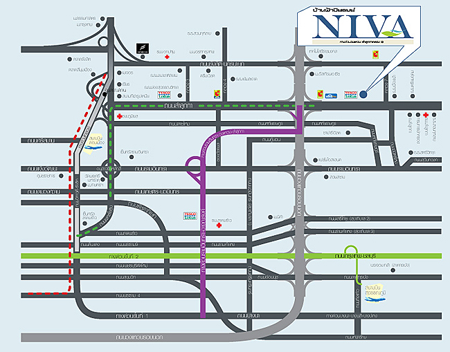 แผนที่โครงการ บ้านฟ้าปิยรมย์นีวา (Baan Fah Piyarom Niva) โครงการตั้งอยู่ที่ ถนนลำลูกกาคลอง 6 ตำบลบึงคำพร้อย อำเภอลำลูกกา จังหวัดปทุมธานี 12150 โครงการอยู่ติดถนนใหญ่ลำลูกกา เชื่อมต่อเข้าสู่ใจกลางเมือง โดยใช้เส้นทางด่วนวงแหวนเพื่อเชื่อมมายังเส้นทางด่วนพิเศษฉลองรัช อาจณรงค์ - รามอินทรา เชื่อมต่อกับถนนหลักหลายเส้น เช่น ถนนวงแหวนกาญจนาภิเษก, ถนนหทัยราษฎร์ และถนนนิมิตรใหม่ รองรับการขยายตัวของเมืองด้วยรถไฟฟ้าสายสีเขียวเข้ม สะพานใหม่ - ลำลูกกา อีกทั้งยังใกล้สถานที่สำคัญ และศูนย์การค้าต่างๆ เช่น ที่ว่าการอำเภอธัญบุรี คลอง 6, สถานีตำรวจธัญบุรี คลอง 6, ห้างสรรพสินค้าฟิวเจอร์พาร์ค รังสิต, โลตัส ลำลูกกา คลอง 6, บิ๊กซี ลำลูกกาคลอง 5 และโฮมโปร