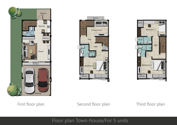 ทาวน์โฮม 3 ชั้น สไตล์โมเดิร์น - ทาวน์โฮม 3 ชั้น หน้ากว้าง 5 เมตร เนื้อที่บ้าน 20 ตร.ว. พื้นที่ใช้สอย 170 ตร.ม. 3 ห้องนอน 4 ห้องน้ำ 1 ห้องพักผ่อน และที่จอดรถ 2 คัน