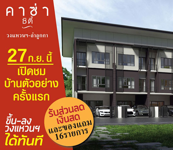 คาซ่า ซิตี้ วงแหวน - ลำลูกกา (Casa City Wongwaen-Lamlukka)" ทาวน์โฮม 3 ชั้น สไตล์โมเดิร์น โดดเด่นทั้งดีไซน์และความลงตัวในการอยู่อาศัย ห่างจากวงแหวนกาญจนาภิเษก 500 ม. โครงการนี้มีลักษณะเป็นทาวน์โฮม 3 ชั้น หน้ากว้าง 5 เมตร มีเนื้อที่บ้านตั้งแต่ 20 ตร.ว. พื้นที่ใช้สอย 170 ตร.ม. มีความเป็นส่วนตัวสูงสุดเพียง 80 หลัง พร้อมสิ่งอำนวยความสะดวกครบครันและระบบรักษาความปลอดภัย CCTV ตลอด 24 ชม.