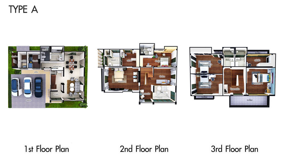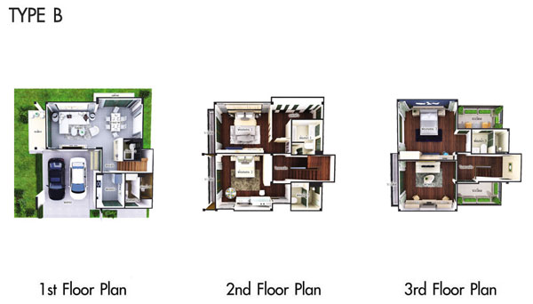 Floor Plan Type A 2. TYPE B - บ้านเดี่ยว 3 ชั้น ขนาด 3 ห้องนอน 4 ห้องน้ำ ห้องพักผ่อน ห้องแม่บ้านพร้อมห้องน้ำส่วนตัว ที่จอดรถ 2 คัน พื้นที่ใช้สอย 300 ตารางเมตร