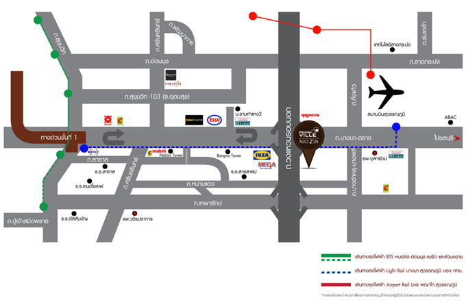 - การเดินทางจากถนนกาญจนาภิเษก (อ่อนนุช) ให้ออกจากถนนกาญาจนาวิ่งเลี้ยวซ้ายออกถนนบางนาตราดแล้วกลับรถหน้า โฮมโปรบางพลีแล้วย้อนกลับมาทาง Mega บางนาที่ตั้งโครงการตั้งอยู่ในสนามกอล์ฟบางพลีใหญ่ ใช้ทางเข้าเดียวกับสถามกอล์ฟบางพลี
