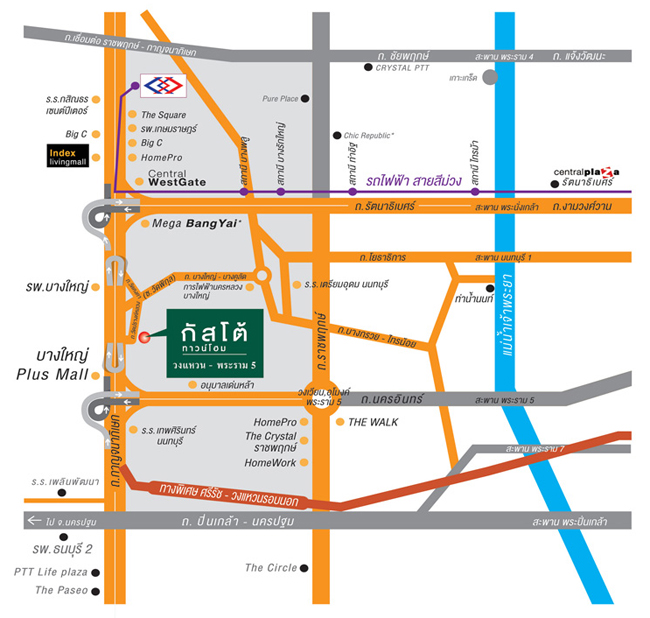 แผนที่โครงการ กัสโต้ วงแหวน - พระราม 5 โครงการตั้งอยู่ที่ ซอยโยธาธิการ ถนนกาญจนาภิเษก ตำบลบางม่วง อำเภอบางใหญ่ จังหวัดนนทบุรี 11140 สามารถเข้าออกได้ ทั้งซอยโยธาธิการ และถนนบางใหญ่บางคูลัด เชื่อมต่อกับถนนหลักหลายเส้น เช่น ถนนนครอินทร์, ถนนรัตนาธิเบศร์, ถนนบางใหญ่-บางคูลัด และถนนราชพฤกษ์ ใกล้สถานที่สำคัญ และศูนย์การค้าต่างๆ เช่น บางใหญ่ Plus Mall, โรงพยาบาลบางใหญ่, เมกา บางใหญ่, โรงเรียนอนุบาลเด่นหล้า, เซ็นทรัลเวสท์เกต, โฮมโปร, บิ๊กซี, อินเด็กซ์ ลิฟวิ่งมอลล์ และโรงเรียนเทพศิรินทร์นนทบุรี
