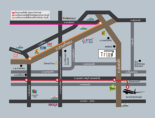 แผนที่โครงการ ทรีโอ ร่มเกล้า โครงการตั้งอยู่ที่ถนนร่มเกล้า แขวงมีนบุรี เขตมีนบุรี กรุงเทพมหานคร 10510 ซึ่งถนนนี้ สามารถเข้า-ออกได้หลายเส้นทาง โครงการเชื่อมต่อกับถนนหลักหลายเส้น เช่น ถนนรามคำแหง, ถนนเคหะร่มเกล้า, ถนนเจ้าคุณทหาร และถนนลาดกระบัง ไม่ว่าจะเข้าเมือง หรือออกนอกเมืองก็สะดวกด้วยทางด่วนมอเตอร์เวย์ ใกล้แหล่งอำนวยความสะดวกและสถานที่สำคัญต่างๆ เช่น บริษัทสหพัฒน์, การเคหะร่มเกล้า, มหาวิทยาลัยเกษมบัณฑิต, Big C ร่มเกล้า, นิคมอุตสาหกรรมลาดกระบัง, สนามบินสุวรรณภูมิ และมหาวิทยาลัยพระจอมเกล้าเจ้าคุณทหารลาดกระบัง