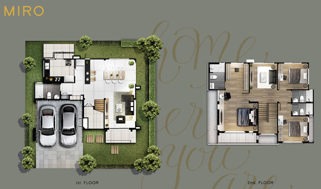 1. MIRO - บ้านเดี่ยว 2 ชั้น เนื้อที่บ้าน 53.7 ตร.ว.ขึ้นไป พื้นที่ใช้สอย 220 ตร.ม. 3 ห้องนอน 4 ห้องน้ำ ห้องรับแขก ห้องรับประทานอาหาร ห้องนั่งเล่น ที่จอดรถ 2 คัน