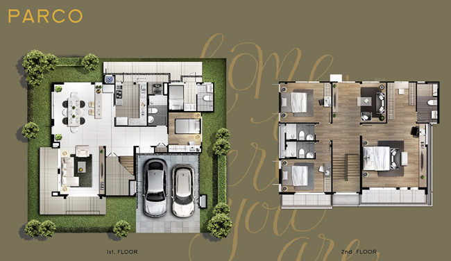 Floor Plan MIRO 2. PARCO - บ้านเดี่ยว 2 ชั้น เนื้อที่บ้าน 53.7 ตร.ว.ขึ้นไป พื้นที่ใช้สอย 275 ตร.ม. 4 ห้องนอน 4 ห้องน้ำ ห้องรับแขก ห้องรับประทานอาหาร ห้องนั่งเล่น ที่จอดรถ 2 คัน