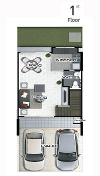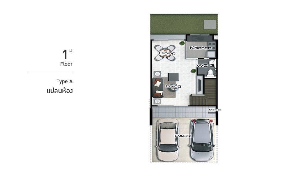 1. TYPE A - ทาวน์โฮม 3 ชั้น พื้นที่ใช้สอย 148 ตร.ม. 3 ห้องนอน, 3 ห้องน้ำ, 1 ห้องพักผ่อน, 1 ห้องครัว, 1 พื้นที่อเนกประสงค์ พร้อมที่จอดรถ 2 คัน