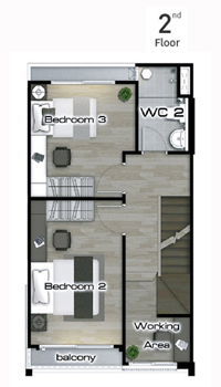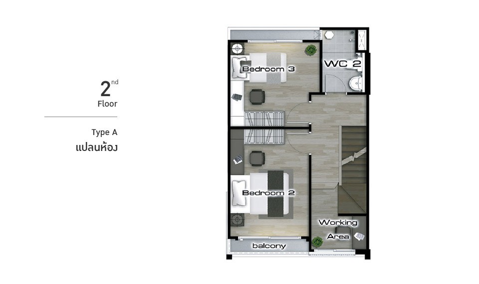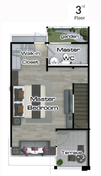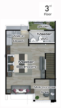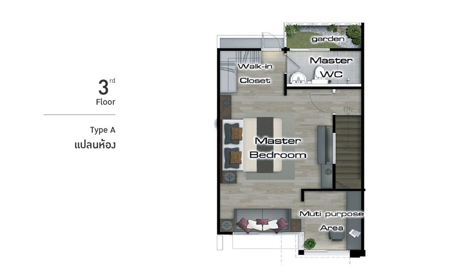 ภาพจำลองแบบบ้าน TYPE A เหนือใครด้วย Penthouse Style Master Bedroom พร้อม Walk-In Closet และ Garden Bathroom ครบครันด้วยครัวไทยแยกส่วนมาตรฐานระดับบ้านเดี่ยว ปรับเปลี่ยนพื้นที่ใช้สอยในสไตล์คุณด้วย Multi Purpose Area ที่ชั้น 3