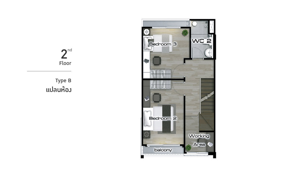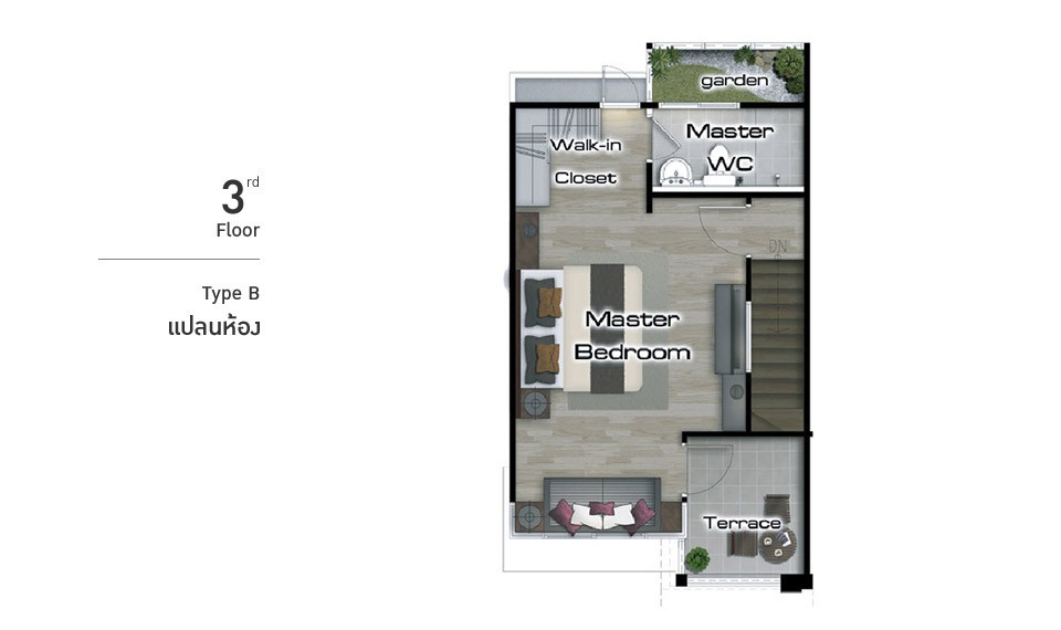 ภาพจำลองแบบบ้าน TYPE B เหนือใครด้วย Penthouse Style Master Bedroom พร้อม Walk-In Closet และ Garden Bathroom ครบครันด้วยครัวไทยแยกส่วนมาตรฐานระดับบ้านเดี่ยว เต็มอิ่มกับบรรยากาศวิวรอบบ้านได้ที่ Terrace ส่วนตัว ที่ชั้น 3