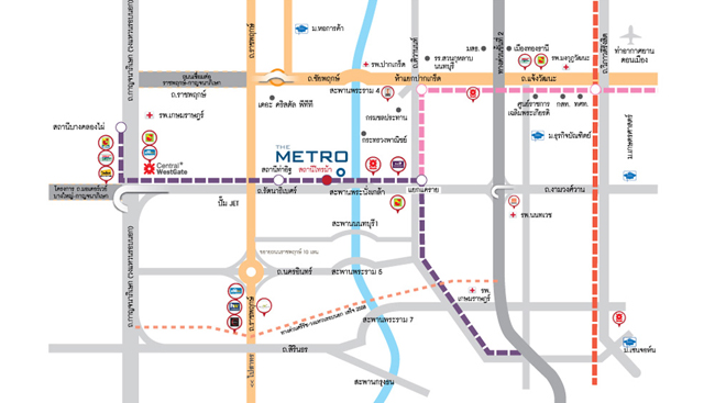 แผนที่โครงการเดอะ เมทโทร รัตนาธิเบศร์ โครงการตั้งอยู่บนถนนรัตนาธิเบศร์ ซอยไทรม้า 7 ตำบลไทรม้า อำเภอเมืองนนทบุรี จังหวัดนนทบุรี 11000 สามารถเดินทางเชื่อมสู่ศูนย์กลางธุรกิจด้วย ถนนราชพฤกษ์ตรงเข้าสู่ถนนสาทร-สีลม และยังเชื่อมต่อถนนหลายสาย เช่น ถนนงามวงศ์วาน, ถนนราชพฤกษ์, ถนนติวานนท์, ถนนสนามบินน้ำ และถนนกาญจนาภิเษก (วงแหวนรอบนอก) รองรับการเดินทางด้วยโครงการรถไฟฟ้าสายสีม่วง สถานีไทรม้า และใกล้จุดขึ้น-ลงทางด่วนงามวงศ์วานอีกด้วย นอกจากนี้ยังไม่ไกลจากสถานที่สำคัญ และห้างสรรพสินค้าต่างๆ เช่น Central รัตนาธิเบศร์, The Walk ราชพฤกษ์, Central Westgate, The Crystal Ptt SB ราชพฤกษ์, เทสโก้ โลตัส, โฮมโปร, บิ๊กซี, สะพานพระนั่งเกล้า, มหาวิทยาลัยเทคโนโลยีราชมงคลสุวรรณภูมิ และเอสพลานาด งามวงศ์วาน-แคราย