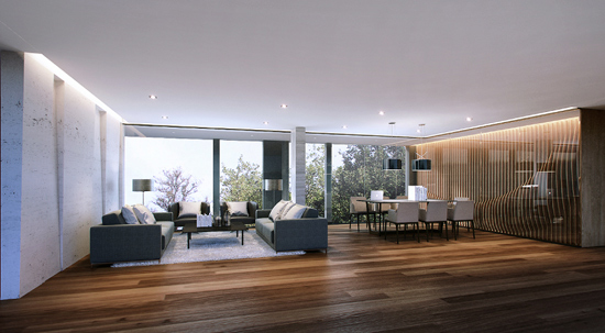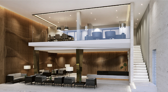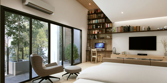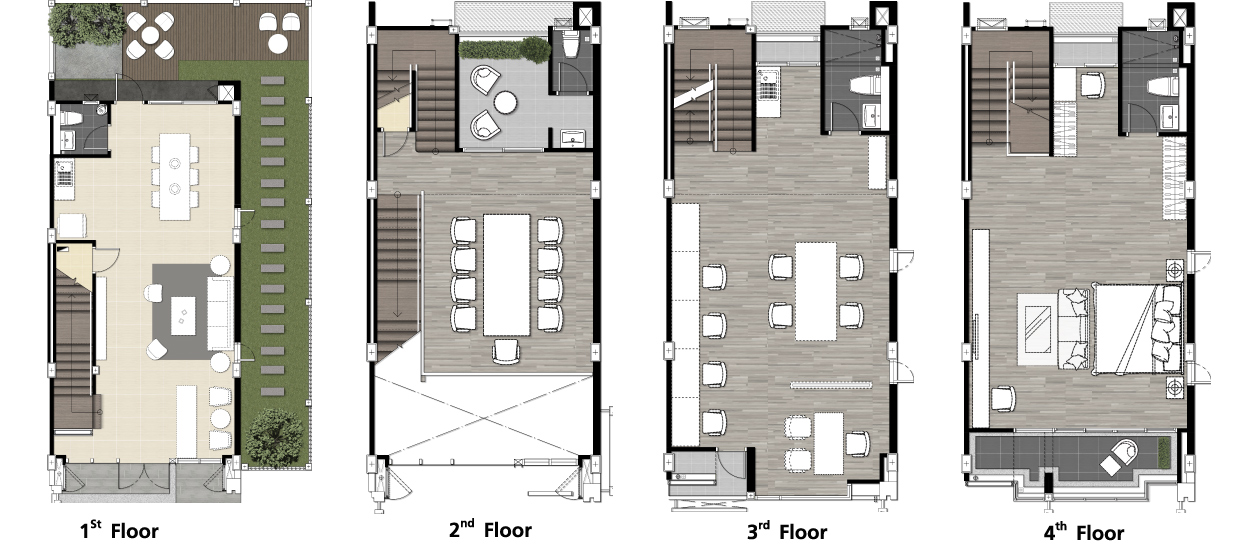 อาคารพาณิชย์ 4 ชั้น - หน้ากว้าง 5.5 เมตร พื้นที่ใช้สอย 250 ตร.ม. เนื้อที่ดินตั้งแต่ 20.8-33.1 ตร.ว. ปรับเปลี่ยนการใช้งาน ได้ตามความเหมาะสม การใช้ Double Volume เพื่อสร้าง Day Lighting Access ออกแบบพื้นที่ด้านหลังอาคาร ให้มีส่วนเปิดโล่งที่เชื่อมต่อมุมมอง กับส่วนพักผ่อนบนชั้น 2 ของอาคาร