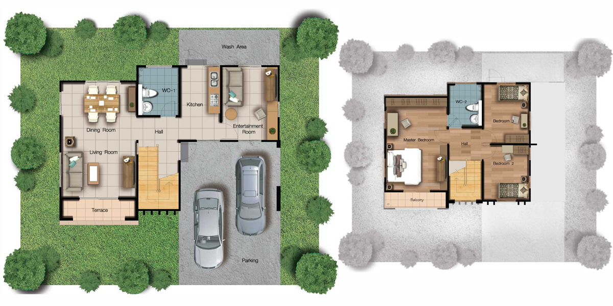 2) แบบบ้าน Cozy - บ้านเดี่ยว ขนาดพื้นที่ใช้สอย 148 ตร.ม. 3 ห้องนอน 2 ห้องน้ำ พื้นที่รับแขก ห้องรับประทานอาหาร ครัวแยกเป็นสัดส่วน เคาน์เตอร์เตรียมอาหาร ที่จอดรถ 2 คัน
