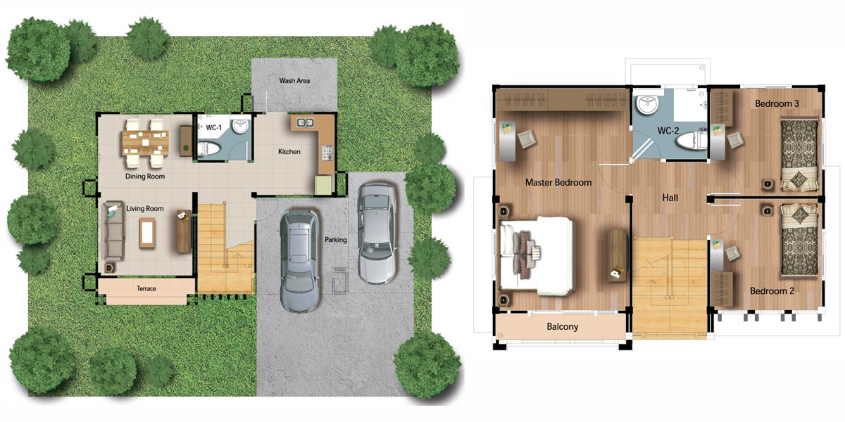 3) แบบบ้าน Craft - บ้านเดี่ยว ขนาดพื้นที่ใช้สอย 155 ตร.ม. 3 ห้องนอน 2 ห้องน้ำ 1 ห้องรับแขก 1 ห้องรับประทานอาหาร ครัวแยกสัดส่วน เคาน์เตอร์เตรียมอาหาร จอดรถ 2 คัน
