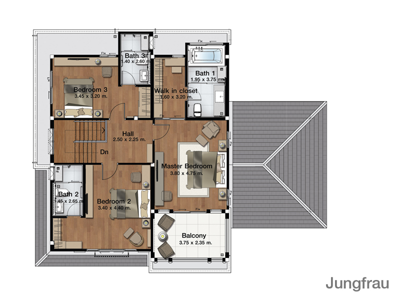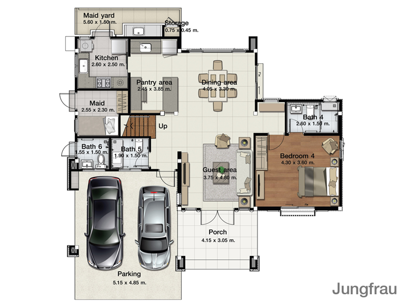 1. Jung Frau - บ้านเดี่ยว 2 ชั้น พื้นที่ใช้สอย 242 ตร.ม. ขนาดที่ดินตั้งแต่ 100 ตร.วา ขนาด 4 ห้องนอน 5 ห้องน้ำ พื้นที่พักผ่อนรับแขก พื้นที่รับประทานอาหาร เชื่อมต่อกับพื้นที่เตรียมอาหาร ครัวไทยแยกส่วน 1 ห้องแม่บ้านพร้อมห้องน้ำ ที่จอดรถ 2 คัน