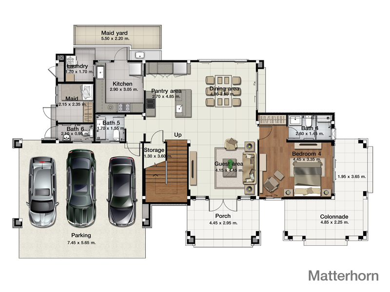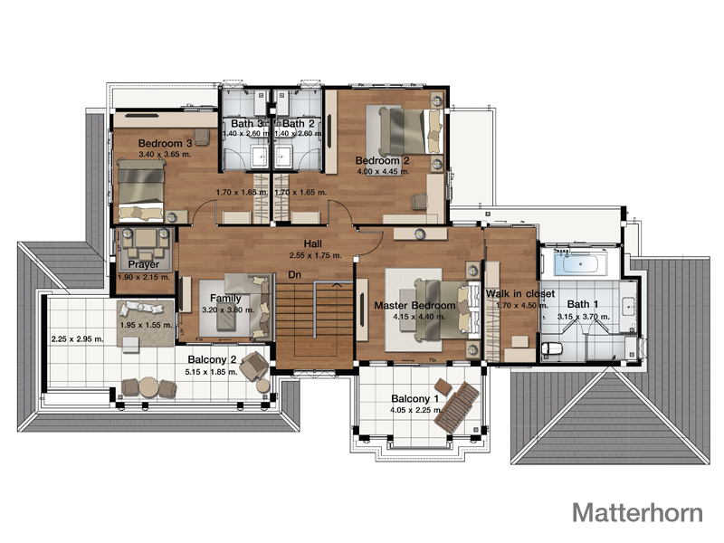 3. Matterhorn - บ้านเดี่ยว 2 ชั้น พื้นที่ใช้สอย 200 ตร.ม. ขนาดที่ดินตั้งแต่ 136 ตร.วา ขนาด 4 ห้องนอน 5 ห้องน้ำ พื้นที่พักผ่อนรับแขก พื้นที่รับประทานอาหาร เชื่อมต่อกับพื้นที่เตรียมอาหาร ครัวไทยแยกส่วน 1 ห้องแม่บ้านพร้อมห้องน้ำ พื้นที่ซักรีด Family Area & Grand Balcony ขนาดใหญ่ที่ชั้นบน ที่จอดรถ 3 คัน