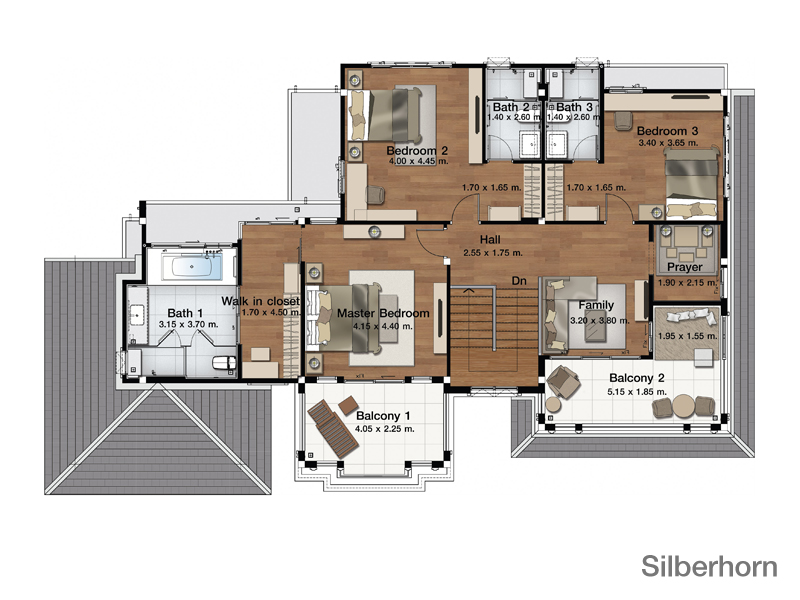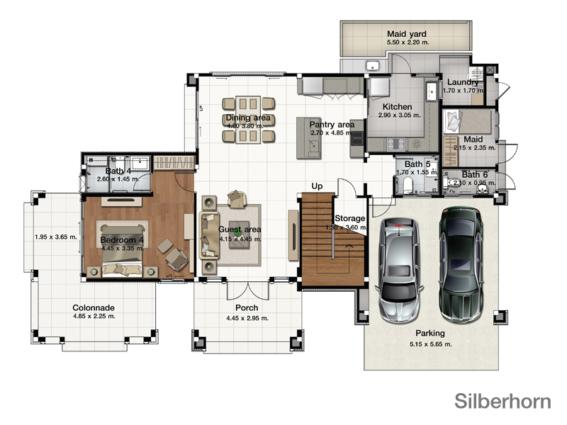 2. Silberhorn - บ้านเดี่ยว 2 ชั้น พื้นที่ใช้สอย 341 ตร.ม. ขนาดที่ดินตั้งแต่ 122 ตร.วา ขนาด 4 ห้องนอน 5 ห้องน้ำ พื้นที่พักผ่อนรับแขก พื้นที่รับประทานอาหาร เชื่อมต่อกับพื้นที่เตรียมอาหาร ครัวไทยแยกส่วน 1 ห้องแม่บ้านพร้อมห้องน้ำ พื้นที่ซักรีด พื้นที่อเนกประสงค์ชั้นบน ที่จอดรถ 2 คัน
