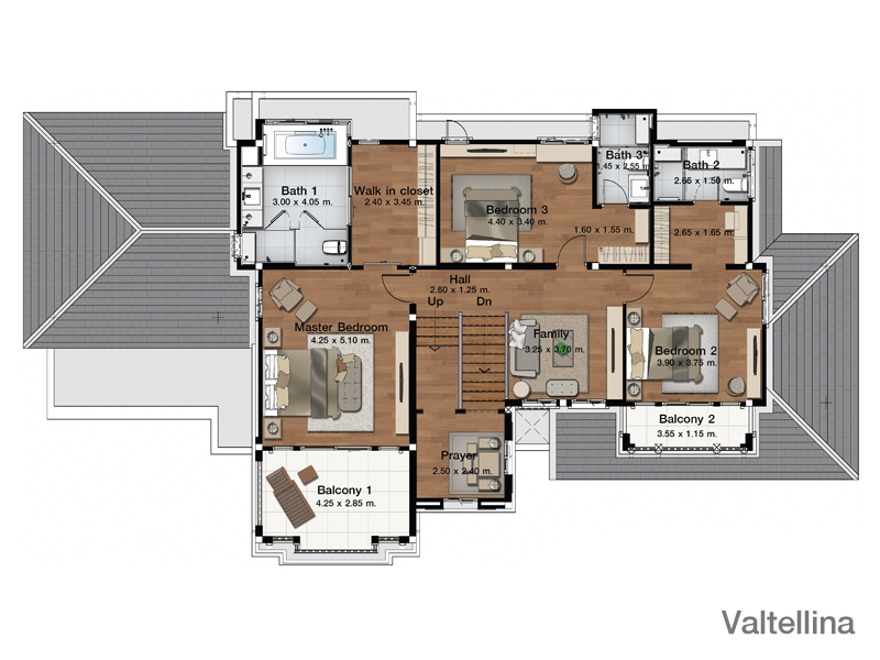 4. Valtellina - บ้านเดี่ยว 2 ชั้น พื้นที่ใช้สอย 387 ตร.ม. ขนาดที่ดินตั้งแต่ 162 ตร.วา ขนาด 4 ห้องนอน 5 ห้องน้ำ พื้นที่พักผ่อนรับแขก พื้นที่รับประทานอาหาร เชื่อมต่อกับพื้นที่เตรียมอาหาร ครัวไทยแยกส่วน 1 ห้องแม่บ้านพร้อมห้องน้ำ พื้นที่ซักรีด Family Area & Grand Balcony ขนาดใหญ่ที่ชั้นบน ที่จอดรถ 3 คัน