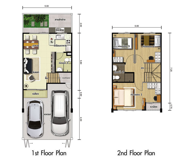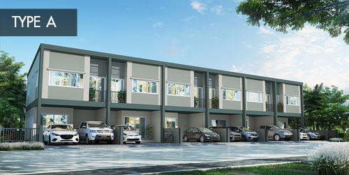 TYPE A - ทาวน์โฮม 2 ชั้น หน้ากว้าง 5.0 ม. พื้นที่ใช้สอยประมาณ 105 ตร.ม. 2 ห้องนอน 1 ห้องอเนกประสงค์ 2 ห้องน้ำ ห้องครัวไทย ที่จอดรถจำนวน 2 คัน