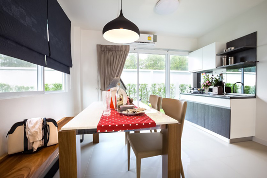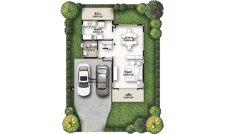 3. แบบบ้านศุภลักขณา - บ้านเดี่ยว 2 ชั้น พื้นที่ใช้สอย 150 ตร.ม. สร้างบนที่ดินตั้งแต่ 50 ตร.ว. ขึ้นไป ขนาด 3 ห้องนอน 3 ห้องน้ำ ที่จอดรถ 2 คัน กั้นส่วนครัวเป็นสัดส่วน