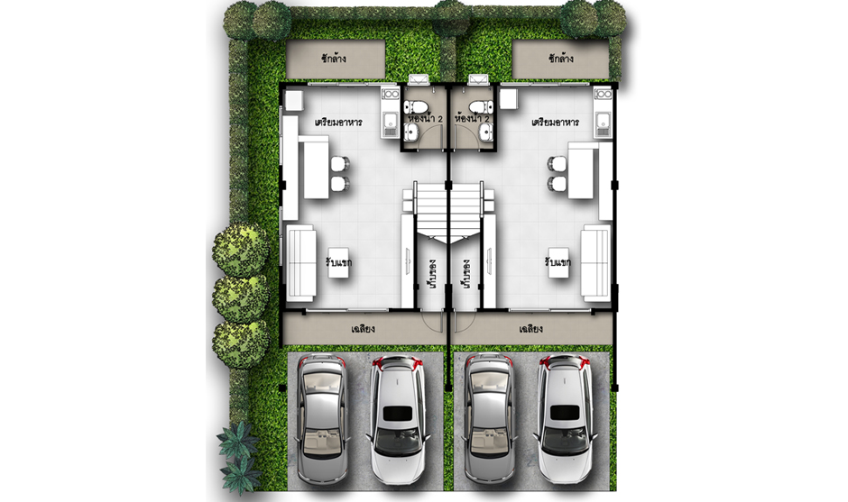 2. แบบบ้านศุภกัลยา - บ้านแฝด 2 ชั้น พื้นที่ใช้สอยเริ่ม 122 ตร.ม. ขนาดที่ดินเริ่มต้น 35 ตร.วา. ขนาด 3 ห้องนอน 2 ห้องน้ำ และที่จอดรถ 2 คัน