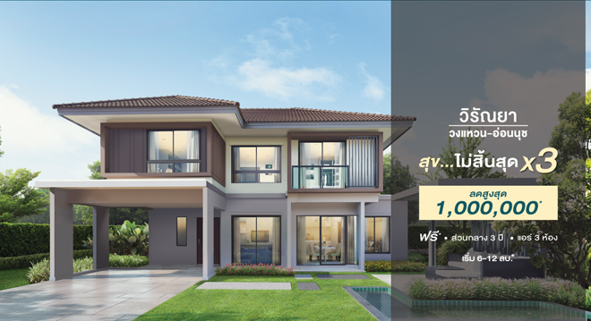 บริษัท เรียลแอสเสท ดีเวลลอปเม้นท์ จำกัด ส่งโปรโมชั่นพิเศษ สุข...ไม่มีสิ้นสุด x 3 กับโครงการ วิรัณยา วงแหวน - อ่อนนุช (Viranya Wongwaen - Onnut) บ้านเดี่ยว 2 ชั้น ทำเลอ่อนนุช - วงแหวน- รับส่วนลดสูงสุด 1,000,000 บาท