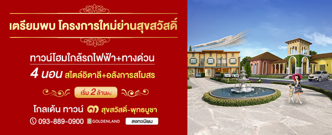 โกลเด้นแลนด์ เปิดให้จองแล้ว โกลเด้น ทาวน์ ๓ สุขสวัสดิ์ - พุทธบูชา (Golden Town ๓ Suksawas - Phutthabucha) เตรียมพบ ทาวน์โฮม โครงการใหม่ ใจกลางเมือง ย่านสุขสวัสดิ์-พุทธบูชา!! เดินทางสะดวกสบาย ใกล้รถไฟฟ้า+ทางด่วน+เซ็นทรัล พร้อมจัดเต็มทุกการอยู่อาศัยในสไตล์อิตาลี กับทาวน์โฮมที่ให้มากถึง 4 ห้องนอน 3 ห้องน้ำ อลังการสโมสร+โรงหนังส่วนตัวราคาเริ่มเพียง 2 ล้านต้น*ผู้ที่สนใจ สามารถลงทะเบียนเพื่อรับสิทธิพิเศษส่วนลดเพิ่ม 10,000 บาท ได้ที่ลิงก์ข้างล่างนี้สอบถามข้อมูลเพิ่มเติม โทร 093-889-0900 เว็บไซต์ www.goldenland.co.th และ Fanpage : https://www.facebook.com/GOLDENLANDRESIDENCEข่าว-โปรโมชั่นล่าสุดอื่นๆ