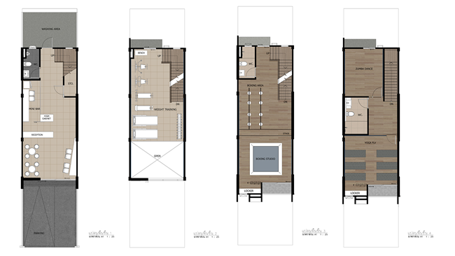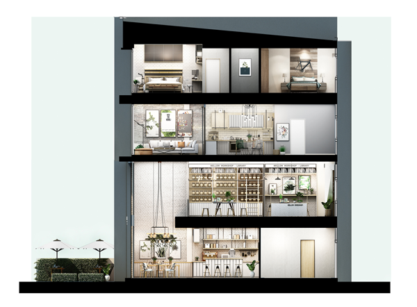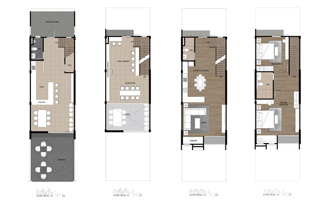 1. Loft Space A - อาคารพาณิชย์/โฮมออฟฟิศ 4 ชั้น พื้นที่ใช้ชีวิต 210 ตารางเมตร หน้ากว้าง 5 เมตร 2 ชั้นสำหรับพื้นที่ธุรกิจ 2 ชั้นสำหรับพื้นที่การใช้ชีวิต พร้อม 2 ห้องนอน 3 ห้องน้ำ 1 ห้องนั่งเล่น 1 Pantry และที่จอดรถ 1 คัน