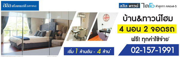 ลลิล ทาวน์ ไลโอ ลำลูกกา คลอง 4-5" พบบ้านและทาวน์โฮม 4 นอน 2 จอดรถ ทำเลสุดปัง ใกล้รถไฟฟ้า ฟิวเจอร์ปาร์ครังสิต ติดทางด่วน ฟรี! ทุกค่าใช้จ่าย