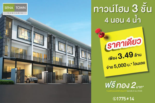 เสนา ทาวน์ รามอินทรา" ทาวน์โฮม 3 ชั้น 4 นอน 4 น้ำ ราคาเดียว เพียง 3.49 ล้านบาท จ่าย 5,000 บาท* โอนเลย ฟรี! ทอง 2 บาท*