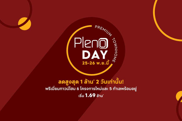 โปรโมชั่น: PLENO DAY พบข้อเสนอสุดพิเศษ ลดสูงสุด 1 ล้านบาท* พรีเมี่ยมทาวน์โฮม 6 โครงการใหม่ และ 5 ทำเลพร้อมอยู่ เริ่ม 1.69 ล้าน 25 - 26 พฤศจิกายน 2560 นี้ 2 วันเท่านั้น