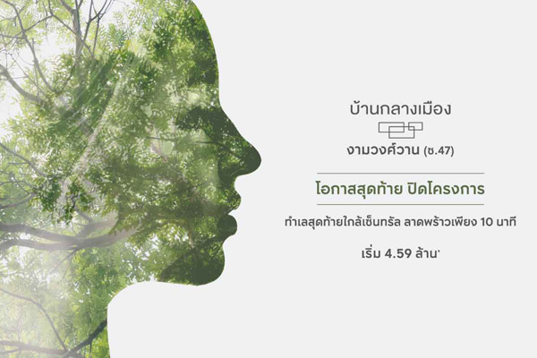 บ้านกลางเมือง งามวงศ์วาน" โอกาสสุดท้ายก่อนปิดโครงการ เริ่ม 4.59 ล้านบาท* ฟรีเฟอร์ทั้งหลัง ทำเลสุดท้ายใกล้เซ็นทรัลลาดพร้าวเพียง 10 นาที ลงทะเบียนรับส่วนลดเพิ่มอีก 100,000 บาท