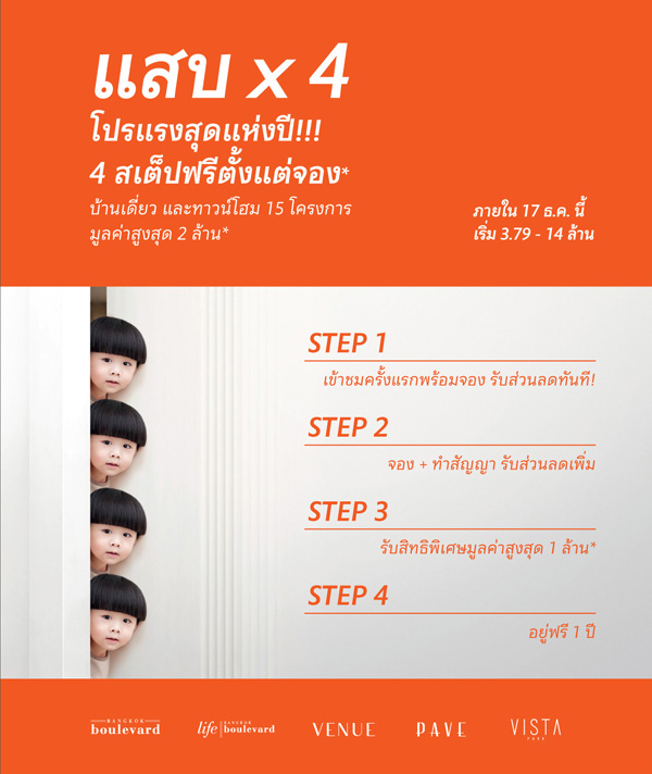www.apthai.com โปรโมชั่น: แสบ x 4 โปรฯแรงสุดแห่งปี 4 สเต็ปฟรีตั้งแต่จอง* บ้านเดี่ยว และทาวน์โฮม 15 โครงการ มูลค่าสูงสุด 2 ล้านบาท* Step 1 เข้าชมครั้งแรกพร้อมจอง รับส่วนลดทันที! / Step 2 จอง + ทำสัญญา รับส่วนลดเพิ่ม / Step 3 รับสิทธิพิเศษมูลค่าสูงสุด 1 ล้านบาท* / Step 4 อยู่ฟรี 1 ปี