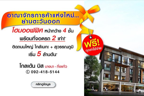 โกลเด้น บิส บางนา-กิ่งแก้ว" เปิดตัวอาณาจักรการค้าแห่งใหม่ย่านตะวันออก โฮมออฟฟิศ หน้ากว้าง 4 ชั้น พร้อมที่จอดรถมากกว่า 2 เท่า!! ตอบโจทย์ทั้งธุรกิจและชีวิตครอบครัว บนทำเลศักยภาพ ติดถนนใหญ่ ใกล้เมกะ+สุวรรณภูมิ เริ่มต้นเพียง 5 ล้านต้น* พิเศษ! จองทันที ฟรีทุกค่าใช้จ่าย*