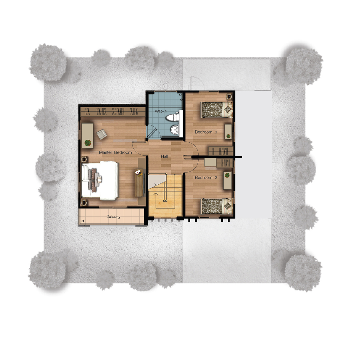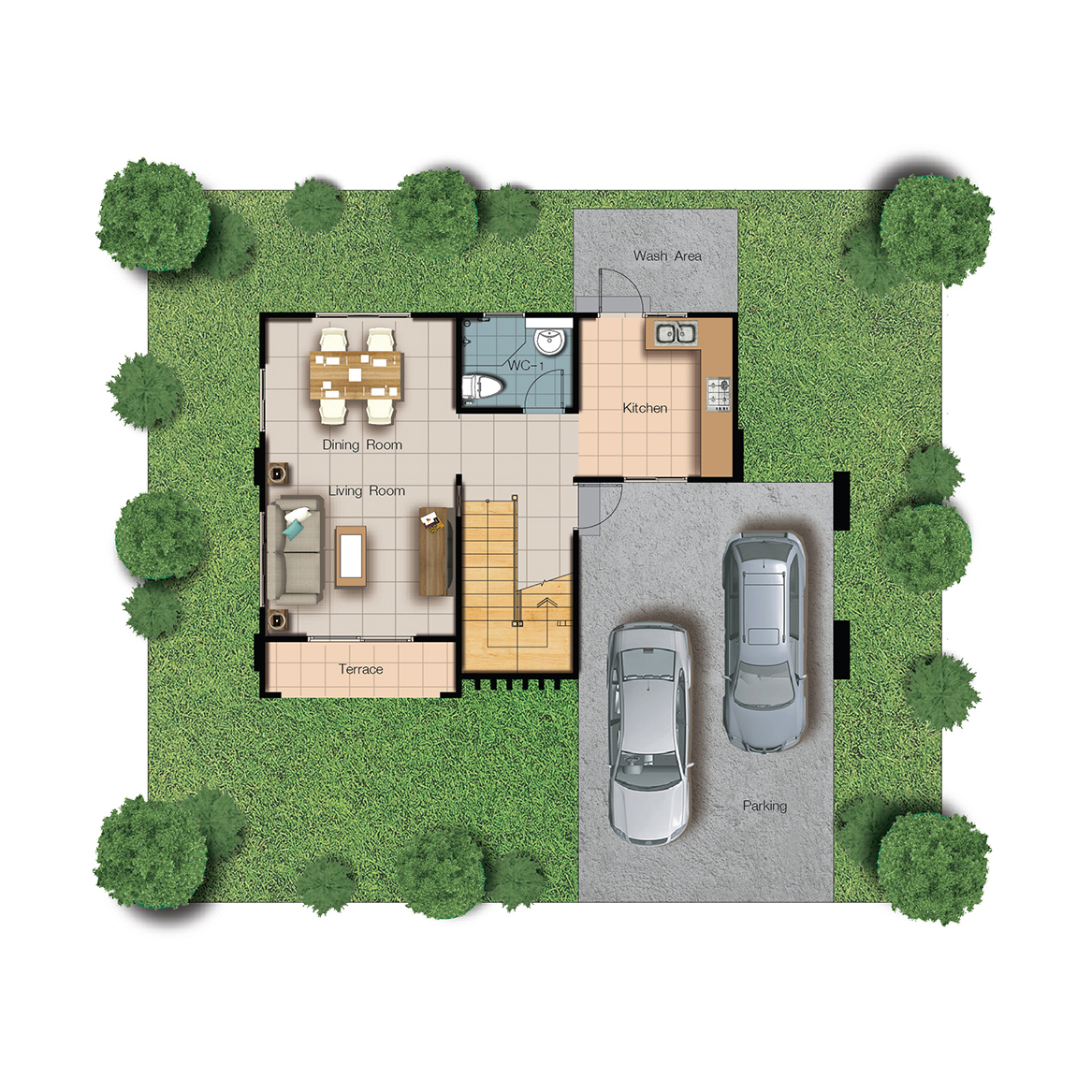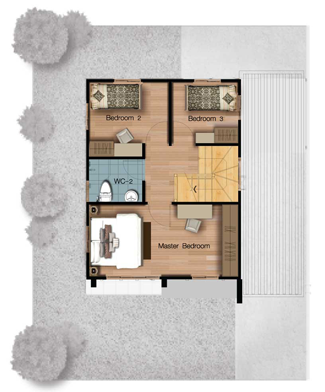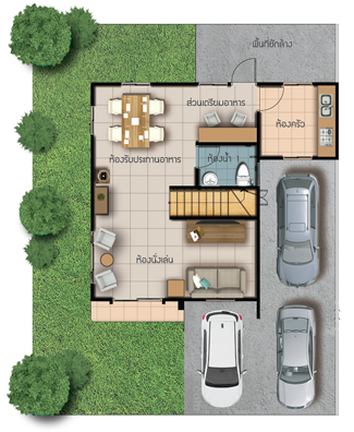 3. แบบบ้าน Craft - พื้นที่ใช้สอย 155 ตารางเมตร 3 ห้องนอน 2 ห้องน้ำ 1 ห้องรับแขก 1 ห้องรับประทานอาหาร ครัวแยกสัดส่วน เคาน์เตอร์เตรียมอาหาร ระเบียงชมวิว จอดรถ 2 คัน