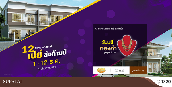 www.pruksa.com โปรโมชั่น: 12 Days Special เปย์ ส่งท้ายปี 1 - 12 ธันวาคม 2560 ณ สำนักงานขาย รับฟรี ทองคำ สูงสุด 2 บาท* ยกขบวนมาทั้ง บ้านเดี่ยวหรูประหยัดพลังงาน บ้านรุ่นใหม่ อาคารพาณิชย์ และคอนโดคุณภาพ บนทำเลศักยภาพ