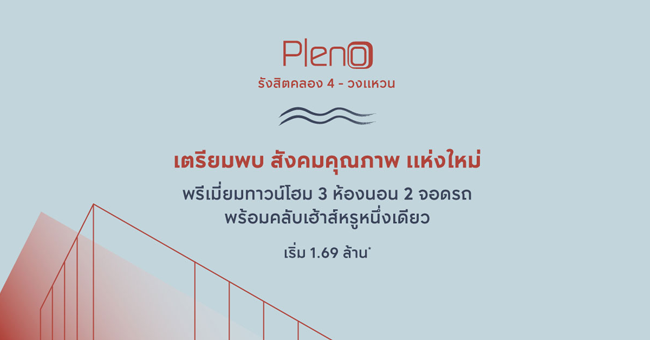 เตรียมพบสังคมคุณภาพแห่งใหม่ "พลีโน่ รังสิตคลอง 4 - วงแหวน" ลงทะเบียนเพื่อรับข่าวสารก่อนใคร เริ่ม 1.69 ล้านบาท