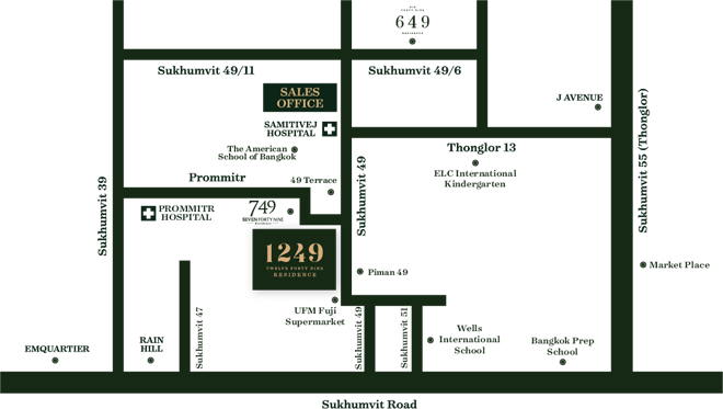 โครงการตั้งอยู่ที่ ซอยสุขุมวิท 49 ถนนสุขุมวิท แขวงคลองตัน เขตวัฒนา กรุงเทพมหานคร 10110 ซึ่งเป็นทำเลศักยภาพ สามารถเข้าออกได้หลายทางไม่ว่าจะเป็นซอยสุขุมวิท 49, 59 หรือเข้าซอยสุขุมวิท 55 (ซอยทองหล่อ) หรือเข้าด้านถนนเพชรบุรีก็ได้ เชื่อมต่อกับถนนหลักหลายเส้น เช่น ถนนเพชรบุรี, ถนนพัฒนาการ และถนนสุขุมวิท สะดวกสบายด้วย BTS สถานีพร้อมพงษ์ และสถานีทองหล่อ