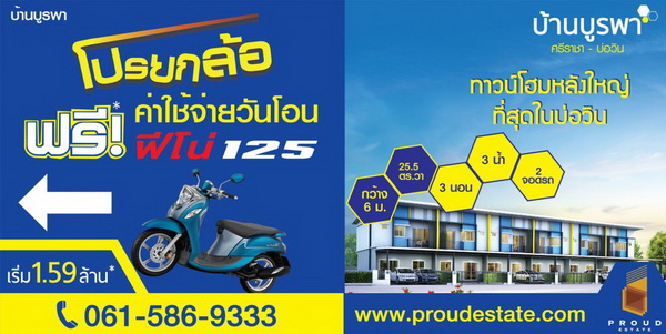 บ้านบูรพา (ศรีราชา-บ่อวิน) ทาวน์โฮมหลังใหญ่ที่สุดในบ่อวิน โปรยกล้อ ฟรี! มอเตอร์ไซร์ Yamaha Fino 125cc 1คัน + ค่าใช้จ่ายวันโอน เริ่ม 1.59 ล้านบาท
