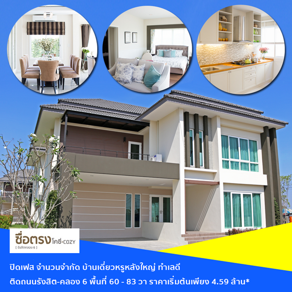 ซื่อตรง โคซี่ รังสิตคลอง 6 พิเศษก่อนปิดเฟส จองบ้านพร้อมอยู่วันนี้ รับส่วนลดพิเศษ 200,000-300,000 บาท* จองภายใน 30 ธ.ค. 60
