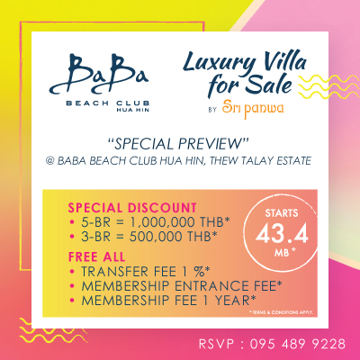 บาบา บีช คลับ หัวหิน ส่วนลดสูงสุด 1 ล้านบาท* ฟรี! อีกหลายรายการ เริ่ม 43.4 ล้านบาท